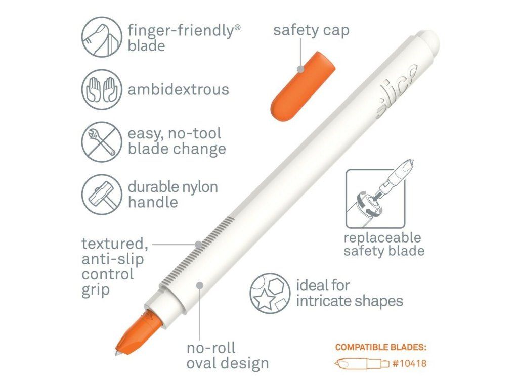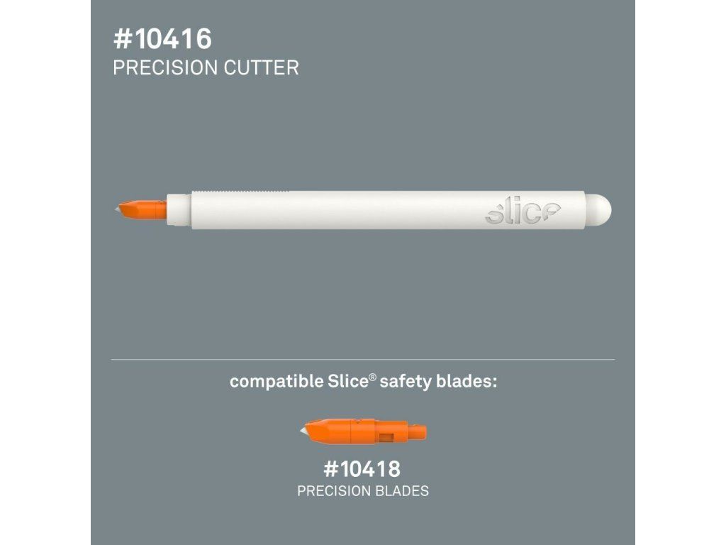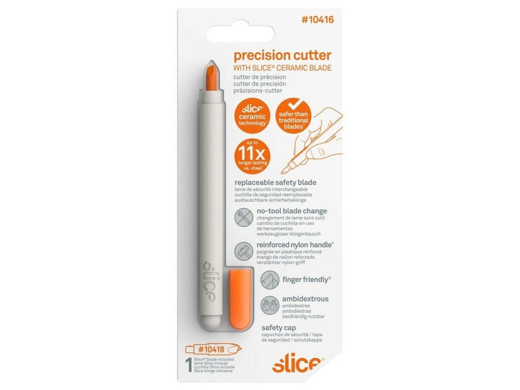 Přesný nůž Slice 10416 je aktualizovaná verze přesných nožů. A to díky novému designu rukojeti, který obsahuje no-roll pohodlný úchop pro lepší kontrolu. Odolná nylonová rukojeť se skleněnou výplní pojme naši vyměnitelnou patronu z mikro-keramiky SKU 10418, takže jakmile se první čepel otupí, můžete ji nahradit jednoduchým otočením a tahem - nepotřebujete žádné vnější nástroje. Ideální pro řezání papíru, vinylu a další tenkých materiálu.