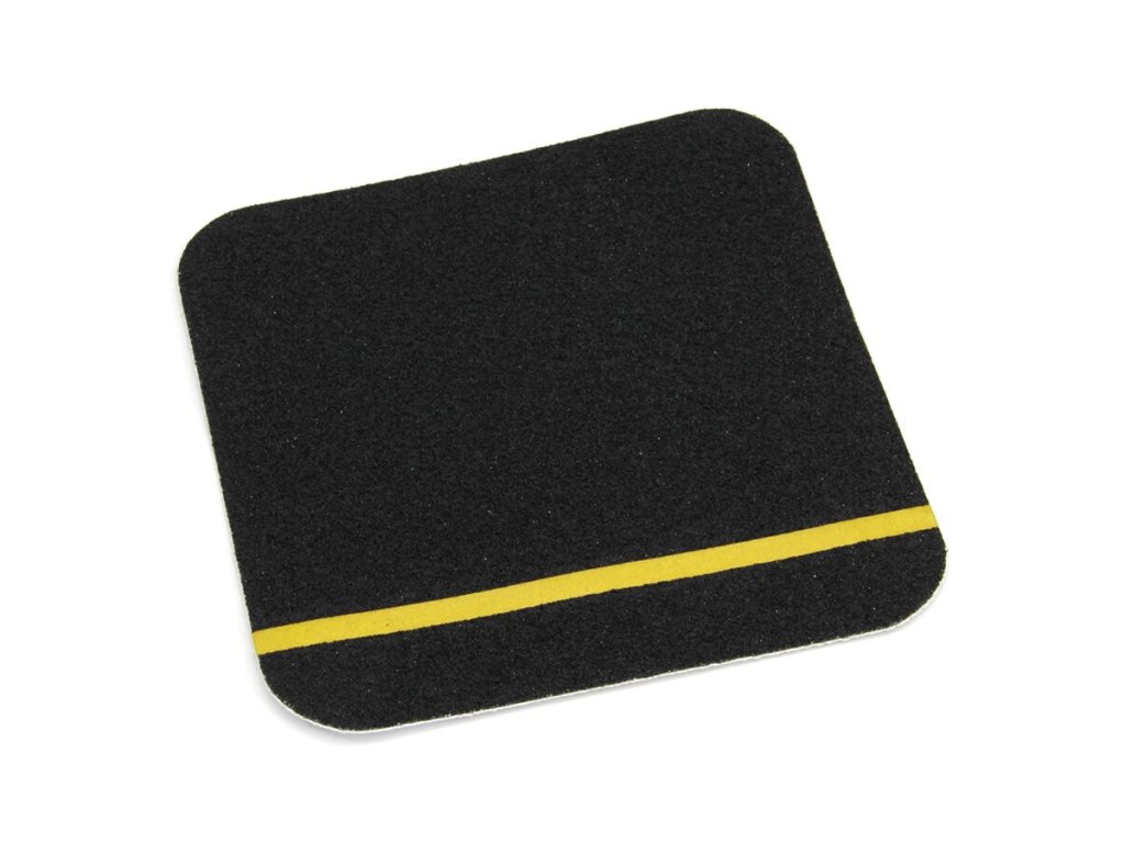 Tyto čtvercové protiskluzové podlahové dlaždice mají na jedné straně žlutý reflexní proužek, který lze použít např. jako náběžnou hranu na schodištích nebo římsách, čímž ji velmi efektivně zvýrazní i za špatných světelných podmínek a zlepší tak bezpečnost daného prostoru. Tyto dlaždičky je možné přilepit i přes 90° hrany.