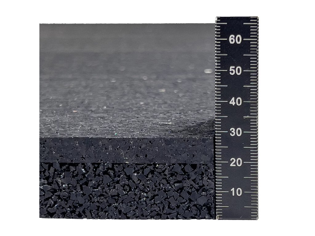 Spodní část: Antivibrační elastomerická guma S650 vyrobená ze směsi pryžového granulátu SBR a polyuretanového pojiva. Tato antivibrační gumová deska má široké využití jako univerzální tlumící, protihluková a antivibrační deska.