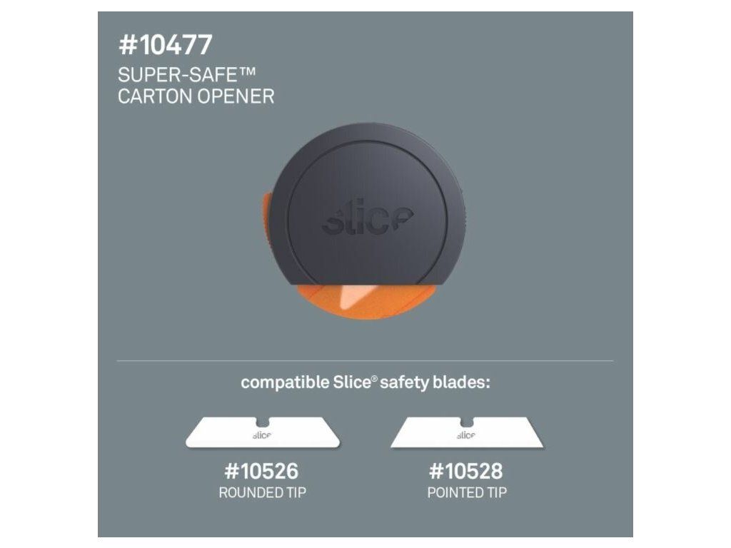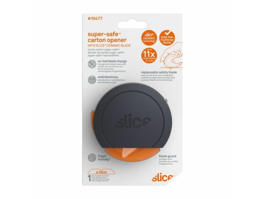 Nůž na krabice Slice 10477 je jedinečný nůž, jehož design ocení zejména lidé se sníženou zručností nebo ti, kteří nosí pracovní rukavice. Jeho velká a kulatá rukojeť se pohodlně vejde do dlaně a snadno s ním docílíte rovných řezů. K uvolnění bezpečnostního krytu čepele stačí ukazovákem stisknout oranžové tlačítko. Poté nástroj rovně přitiskněte k povrchu, který chcete řezat, a táhněte směrem k sobě. Jakmile nůž ztratí kontakt s řezaným materiálem, bezpečnostní kryt čepele se vrátí do původní pozice a ochrání vás před případnými zraněními.