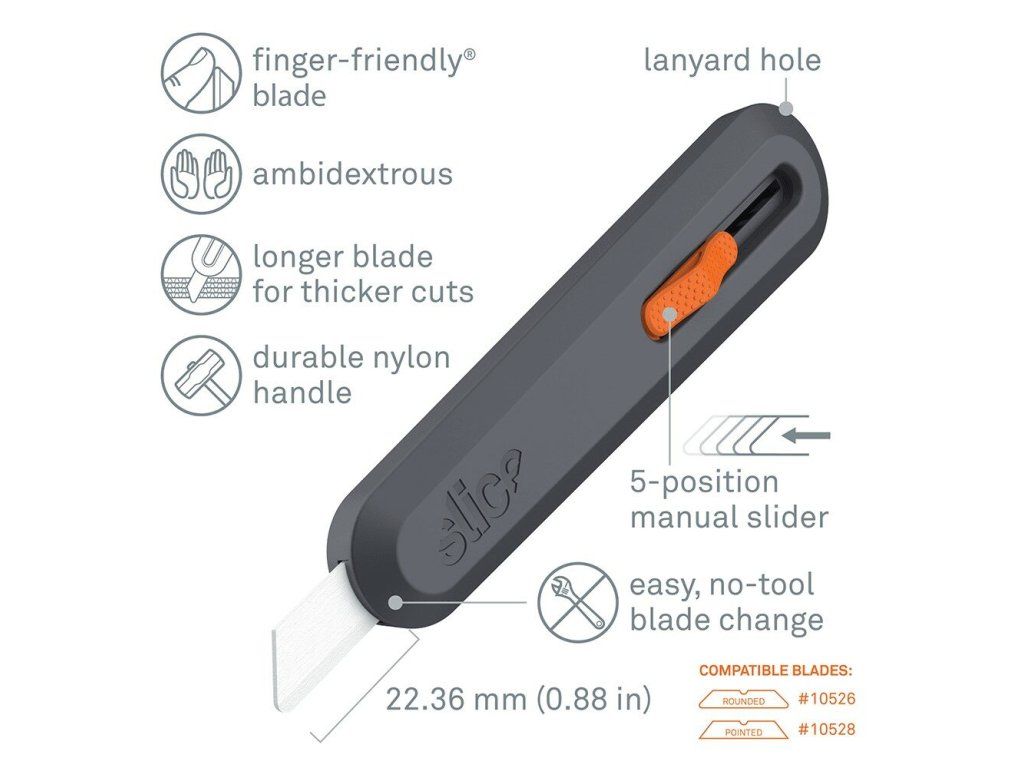 Polohovatelný univerzální nůž Slice 10550 je perfektní volbou v kategorii bezpečnostních nožů. Tento řezací nástroj je především přizpůsoben k průmyslovému použití s jedním cílem: udělat řezání bezpečnější tak, aby to nebylo na úkor efektivity nástrojů.