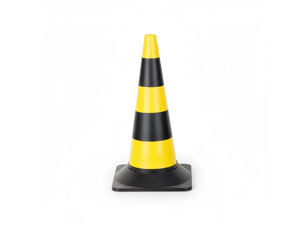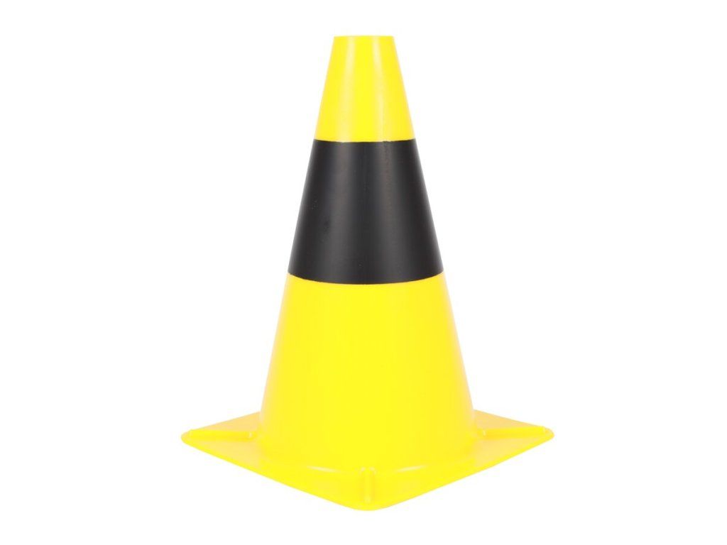 Černo-žlutý výstražný dopravní kužel je vhodný k dočasnému značení nebezpečných úseků a překážek ve výrobních halách a skladech, pro upozornění na překážku či jinak nebezpečný úsek. Vnitřek je dutý a je možno ho naplnit pískem pro větší stabilitu. Podložka ve tvaru čtverce zabraňuje kutálení kužele v případě jeho převrácení.