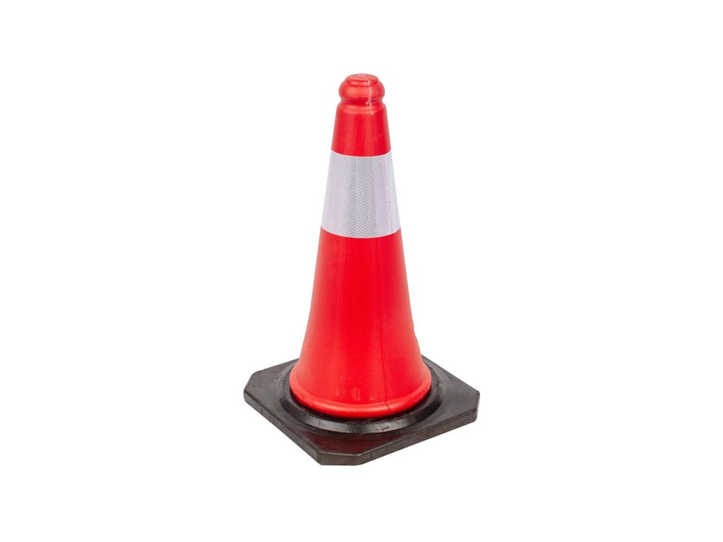 Maximální viditelnost a včasné varování zajišťuje výrazná červená barva doplněná o reflexní pruh o šířce 10 cm. Tento široký pruh efektivně odráží dopadající světlo, čímž zaručuje, že je kužel dobře rozpoznatelný i za šera, v noci nebo při zhoršených povětrnostních podmínkách. Klíčovou předností je těžká gumová základna o rozměru 28 × 28 cm, která výrazně zvyšuje stabilitu kuželu a zabraňuje jeho převržení větrem nebo prouděním vzduchu od projíždějících aut.