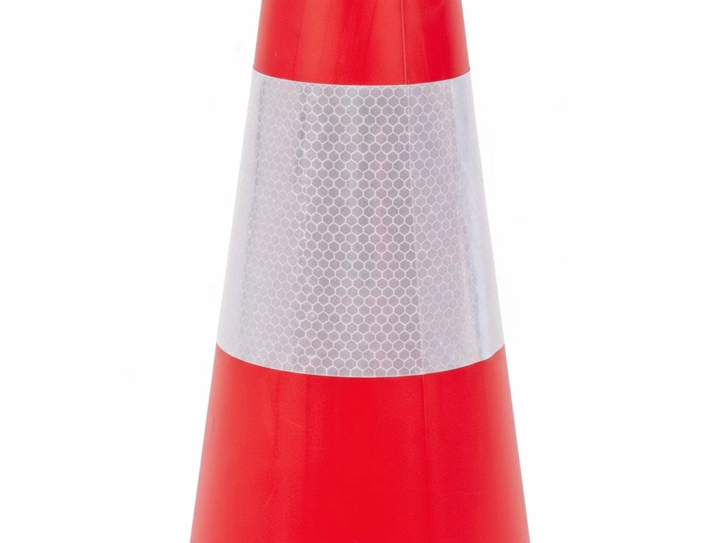Absolutní špičku v pasivní bezpečnosti zajišťuje výrazné červené provedení doplněné o extrémně široký reflexní pruh (32 cm). Tato obrovská reflexní plocha zabírá téměř třetinu výšky kuželu, což zaručuje bezkonkurenční odraz světla světlometů za tmy, husté mlhy nebo přívalového deště. Stabilitu celého prvku garantuje masivní gumová základna o rozměru 49 × 49 cm, která díky celkové hmotnosti 5 kg drží kužel pevně na místě i při extrémních poryvech větru nebo silných tlakových vlnách od projíždějících kamionů.