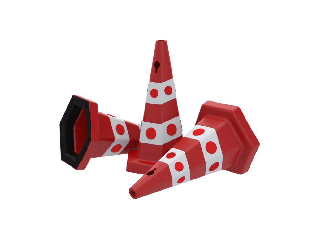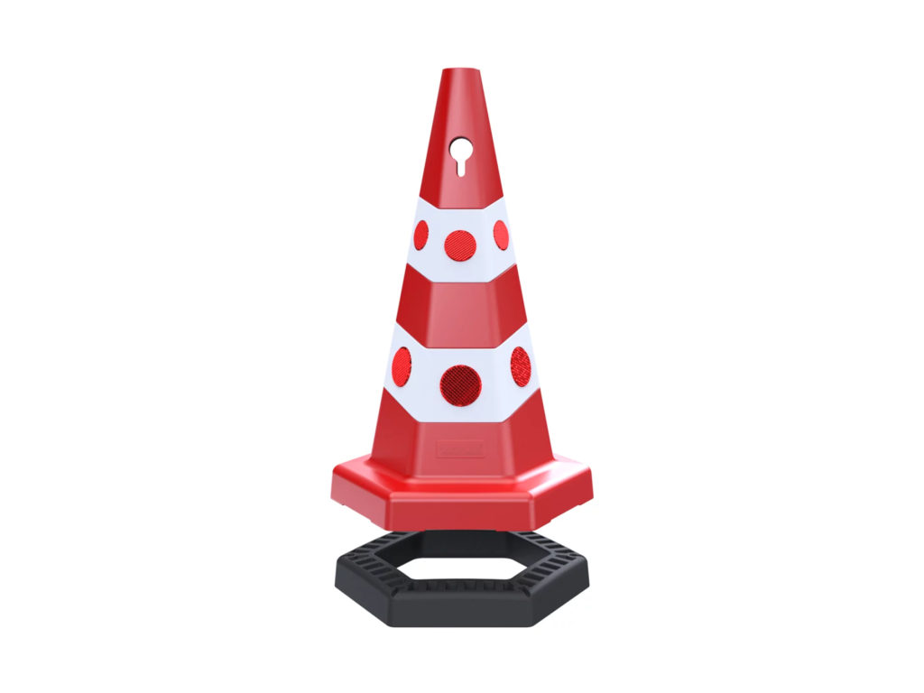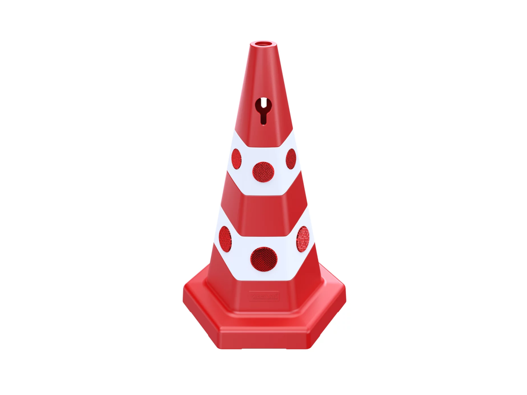 Kromě bezpečnosti slouží tento model skvěle i jako reklamní a navigační nosič. Horní část kuželu je uzpůsobena pro upevnění výstražných tyčí, informačních vlajek, tabulí nebo bariérových řetězů. Hybridní materiál PPC + PVC je testován pro extrémní teploty od -20 °C do +60 °C a je plně imunní vůči UV záření, což garantuje stálost barev a dlouhou životnost i při trvalém venkovním nasazení.