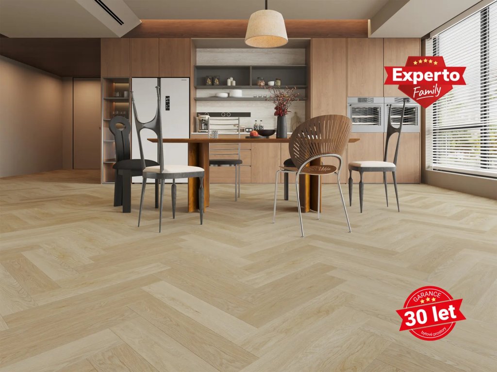 Podobně jako ostatní produkty v řadě Experto Click SPC 50 i varianta Herringbone poskytuje rozměrovou stálost a vysokou tvrdost díky pevnému jádru vyrobenému z minerálního prášku a epoxidových materiálů. Tato podlaha má tloušťku 6 mm, obsahuje nášlapnou vrstvu 0,5 mm a integrovanou IXPE podložku o tloušťce 1 mm.