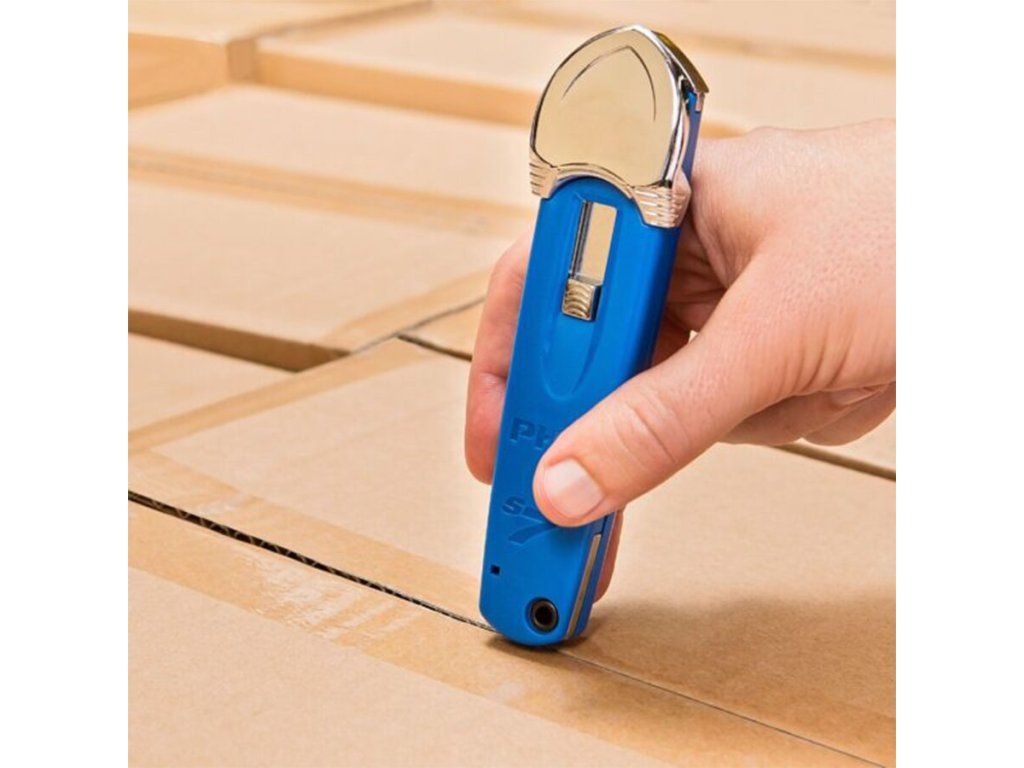 Ochranný kryt zakrývá čepel při řezání shora, aby chránil uživatele, a jedinečný úhel čepele je nastaven speciálně tak, aby nedošlo k poškození obsahu v krabici. Odpruženou čepel lze také v případě potřeby vysunout bez ochranného krytu a má tři blokovací polohy hloubky čepele; horní řez, mělký řez podnosem a hluboký řez. Integrovaná řezačka fólií je ideální pro bezpečné řezání smršťovacích fólií, plastových pásků, motouzů a dalších. Uživatelé také chrání používání vysoce odolného rozřezavače pásky při otevírání krabic dále zabraňuje zranění a prodlužuje životnost čepelí. Díky nejsnazší výměně čepele na trhu tento univerzální řezací nástroj snižuje nákladná poranění žiletkou a dělá řezání krabic bezpečným, snadným a pohodlný.