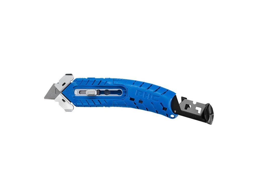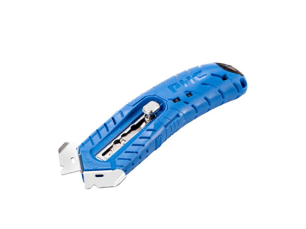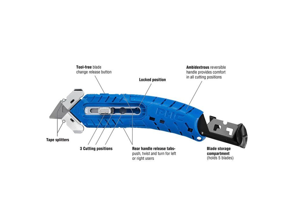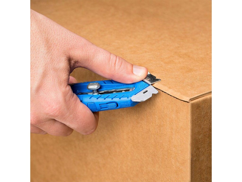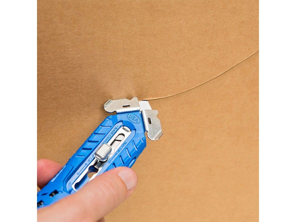 Jedinečný úhel čepele je nastaven speciálně tak, aby nedošlo k poškození obsahu v krabici. Navíc tento adaptabilní bezpečnostní nůž má tři polohy hloubky čepele pro zvýšení účinnosti; horní řez, mělký řez podnosem a hluboký řez. Použití rozřezávače folie zabraňuje zranění a prodlužuje životnost čepelí.