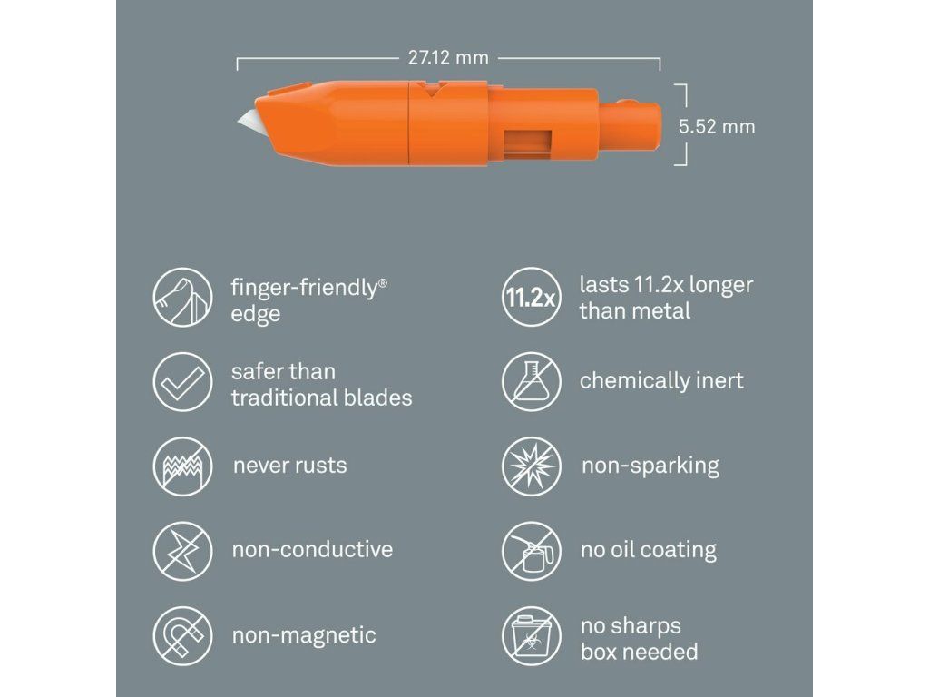 Náhradní čepele SKU 10418 jsou vyrobeny ze 100% oxidu zirkoničitého, což je moderní keramický materiál, který kombinuje řadu užitečných funkcí, které ho odlišují od typických ocelových čepelí. Oxid zirkoničitý je nejiskřivý, nevodivý, nemagnetický, chemicky inertní, nekoroduje a nepotřebuje mazat olejem.