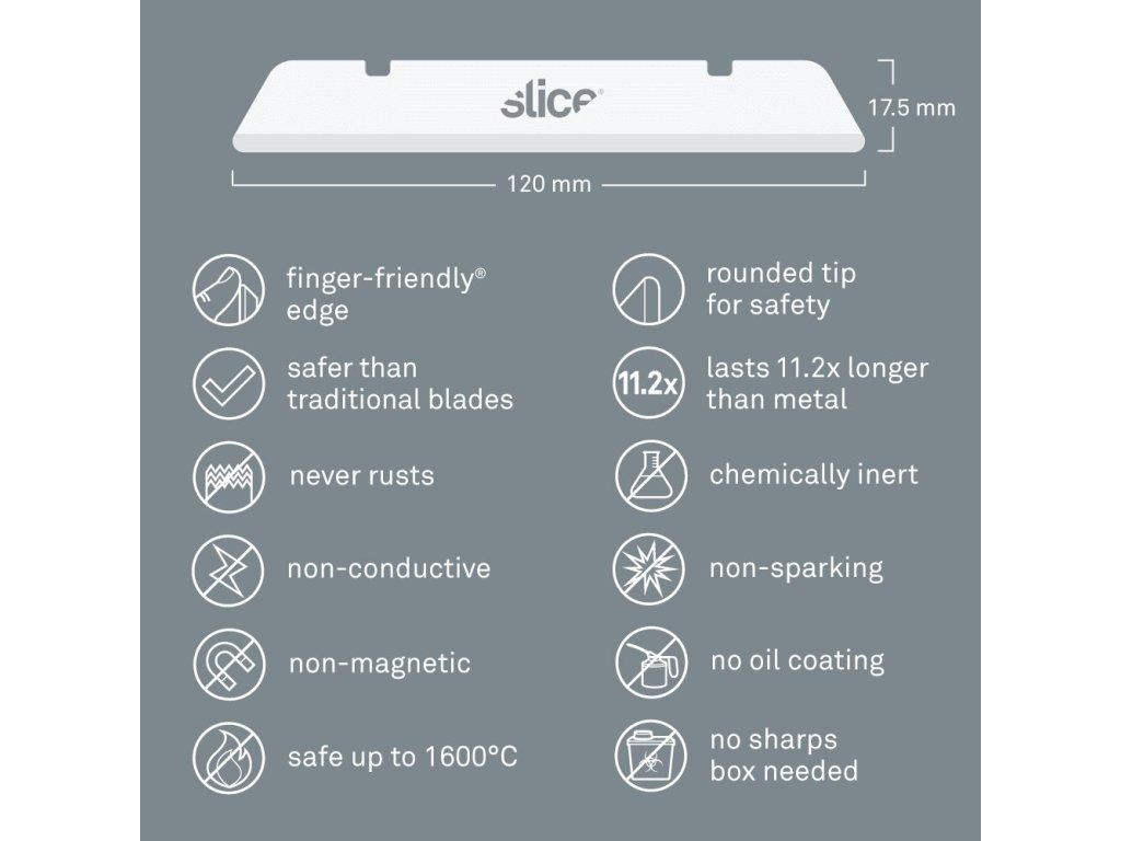 - bezpečnostní čepele Slice jsou chemicky netečné, nemagnetické, nevodivé, nejiskřivé, nerezavějící
