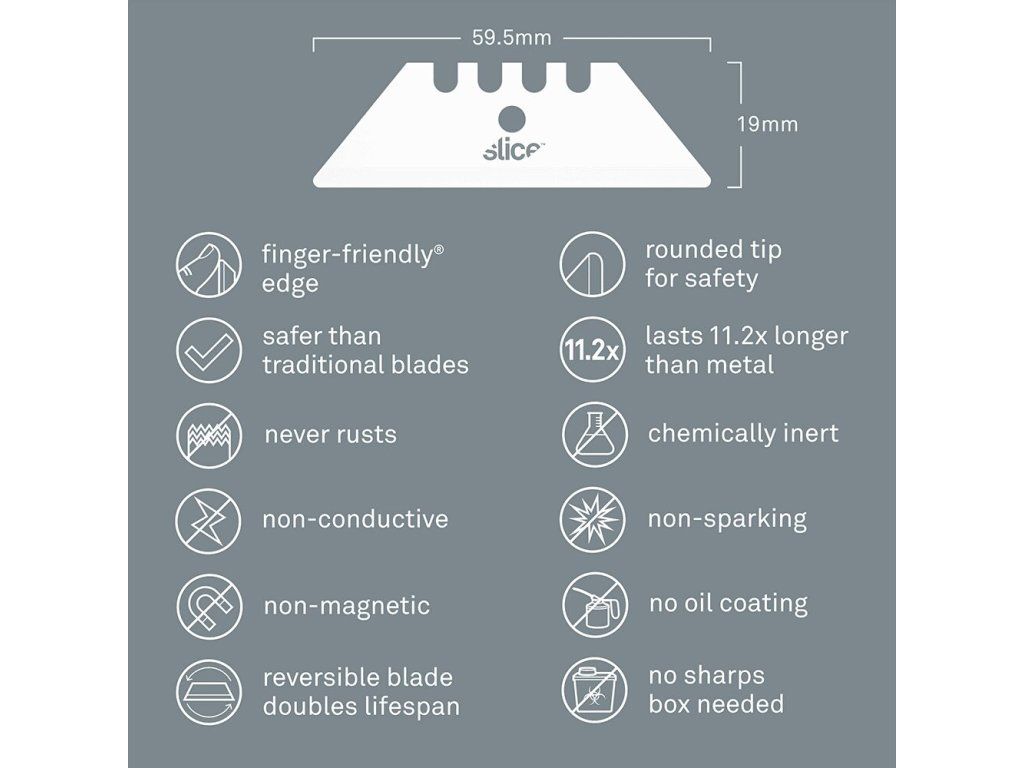 - bezpečnostní čepele Slice jsou chemicky netečné, nemagnetické, nevodivé, nejiskřivé, nerezavějící