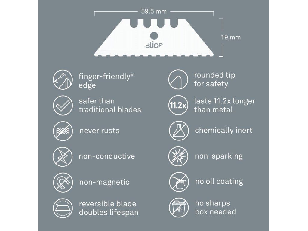 - bezpečnostní čepele Slice jsou chemicky netečné, nemagnetické, nevodivé, nejiskřivé, nerezavějící