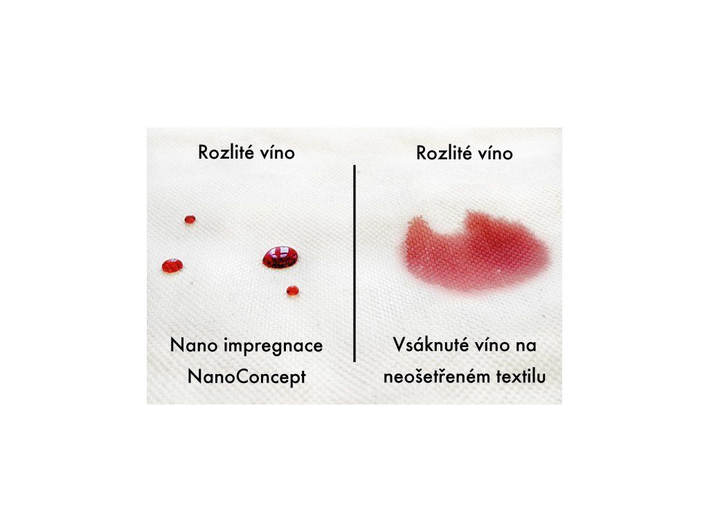 Díky extrémně odpuzujícímu efektu nano impregnace zabraňuje vniknutí vlhkosti, skvrnám od kávy, červeného vína, mastnotě - jednoduše všem nečistotám. Navíc čištění naimpregnového materiálu nebylo nikdy snadnější - pouze hadřík a voda!