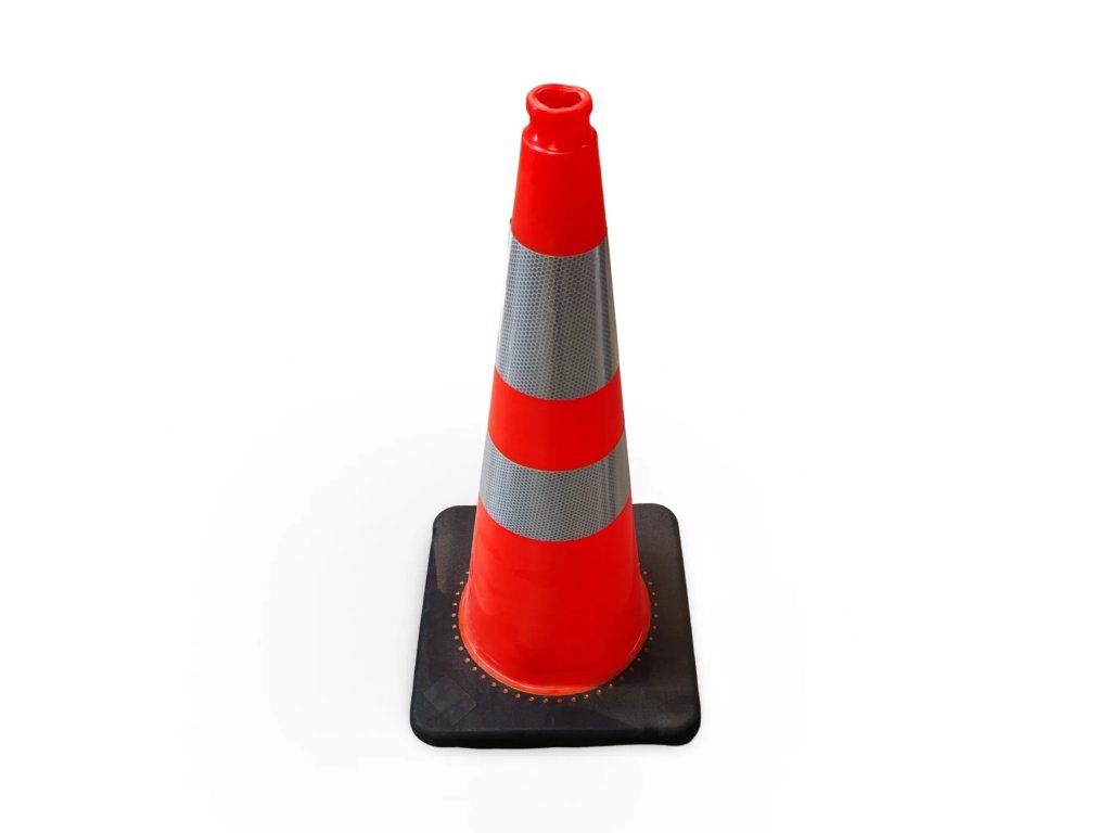 Vynikající viditelnost za každé situace zajišťuje výrazná oranžová barva těla kuželu doplněná o dva široké reflexní pruhy o šířce 10 cm. Tato dvojitá reflexní plocha splňuje přísné nároky na bezpečnost a zaručuje, že je kužel včas rozpoznatelný i za tmy, mlhy nebo prudkého deště. Klíčovým prvkem je masivní gumová základna o rozměru 36 × 36 cm, která zajišťuje špičkovou stabilitu a odolnost proti převržení poryvy větru či tlakovou vlnou od projíždějících nákladních vozidel.