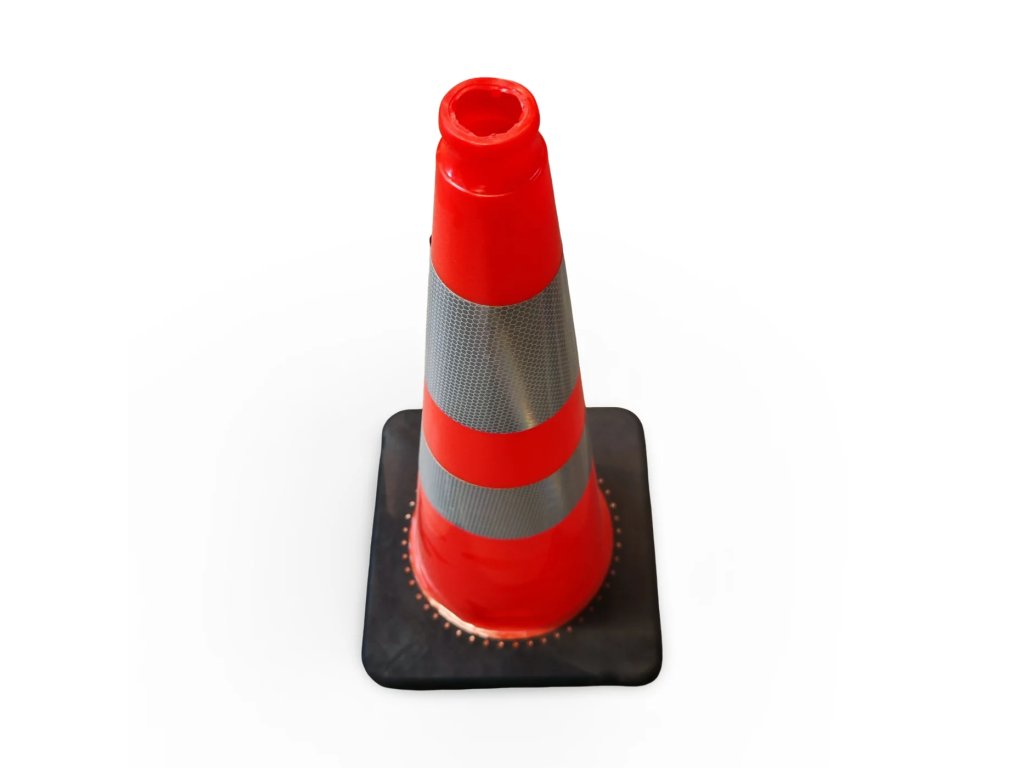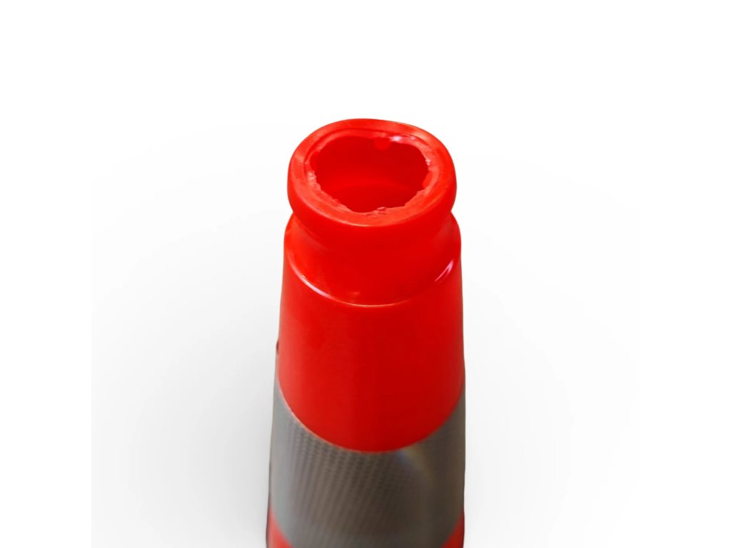 Dopravní kužel je vyroben z vysoce kvalitního PVC v kombinaci s recyklovanou gumou, což mu dodává extrémní mechanickou odolnost a elasticitu. Materiál je plně UV stabilní a odolává teplotním výkyvům, což zabraňuje jeho blednutí a křehnutí v náročných venkovních podmínkách. Navzdory své robustnosti a celkové hmotnosti 3,3 kg zůstává kužel snadno stohovatelný, což usnadňuje jeho transport a skladování v servisních a zásahových vozech.