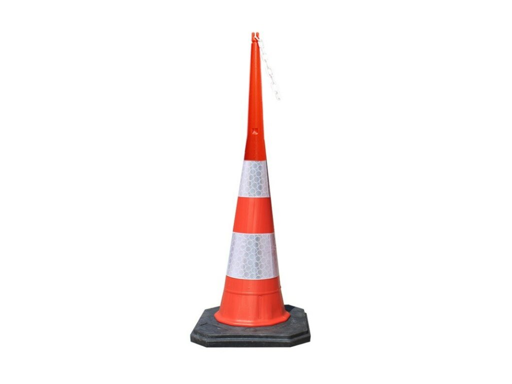 Oranžový plastový dopravní kužel s reflexním pruhem s mobilními překryvy umožňují dočasné oplocení zón v průmyslových provozech. Označují a informují o místech silničních prací. Reflexní kužely jsou vybaveny plastovým překrytím, které umožňuje připevnění řetězových článků k profilované rukojeti.