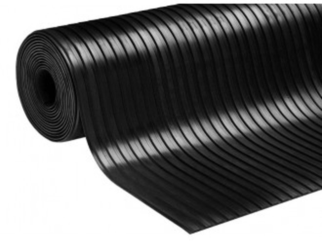 Černá průmyslová protiskluzová podlahová guma s dezénem "podélné rýhy" má vynikající protiskluzové, protihlukové a tlumící vlastnosti. Je velice nenáročná na údržbu, velice snadno a rychle se pokládá a čistí.