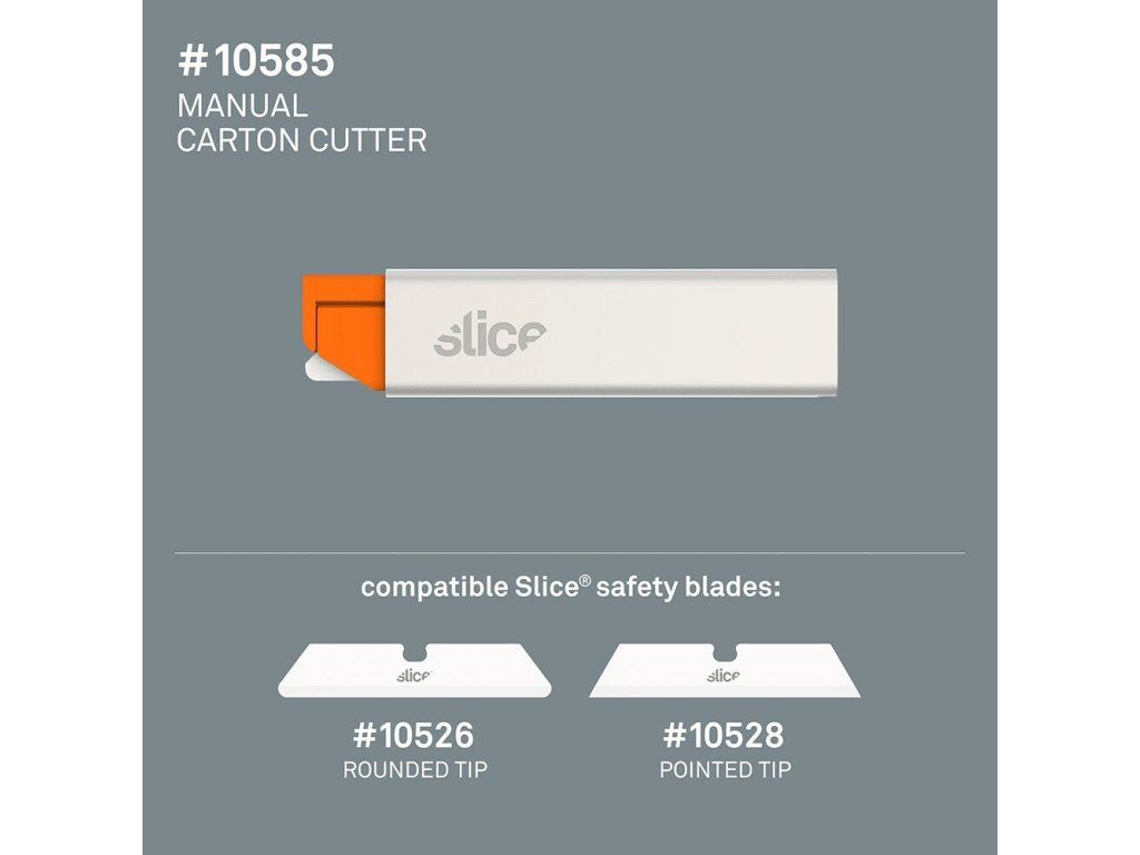 Polohovatelný nůž na krabice Slice 10585 je chytrý doplněk řady bezpečnostních nožů. Jak již název napovídá, design nástroje je ideální pro lepenku a tenké vlnité lepenky. Tento polohovatelný nůž má právě dostatečnou expozici ostří, která se snadno prořízne skrz krabici bez obav z poškození obsahu balení. Posunutí ochranného kovového krytu nože funguje tak, aby zakryl nebo podle potřeby odkryl čepel. Nůž je dodáván se zaoblenou čepelí.