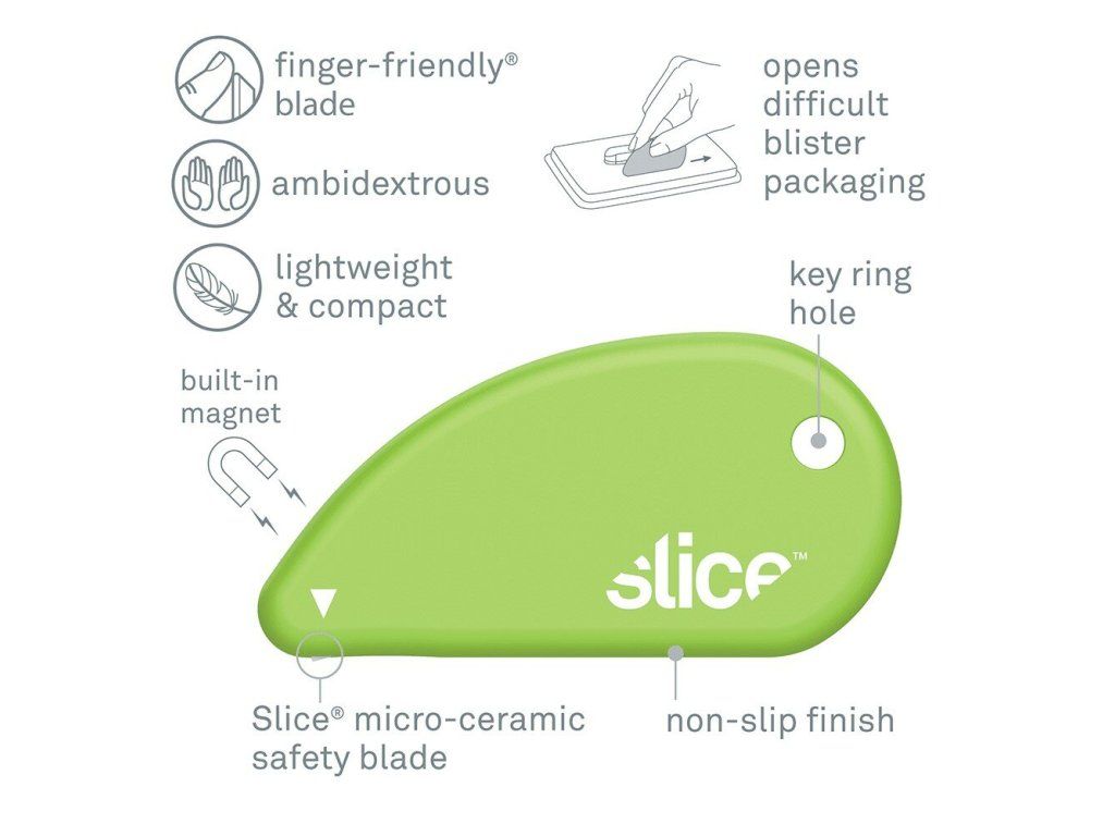Bezpečnostní univerzální nožík Slice 00200 je jedním z nejoblíbenějších nožů. Jeho mikro keramická čepel efektivně řeže tenké materiály a zároveň chrání prsty díky jedinečnému finger-friendly® ostří. Ačkoliv byl tento bezpečnostní řezač ve tvaru myši původně určen k použití v domácnosti (exceluje totiž v řezání lepící pásky a rozbalování zakoupeného zboží), našel po celém světě využití v průmyslovém prostředí. Tento bezpečnostní řezač můžete mít vždy při ruce díky otvoru na šňůrku a zabudovanému magnetu.